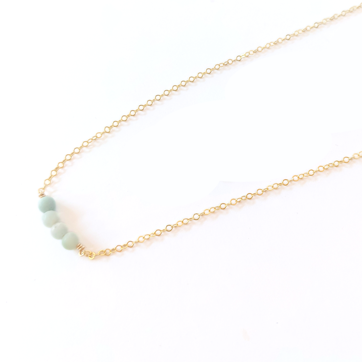 A delicate 14 karat gold filled chain with four ethically-sourced amazonite gemstone spheres creates a beautiful minimalist look.
