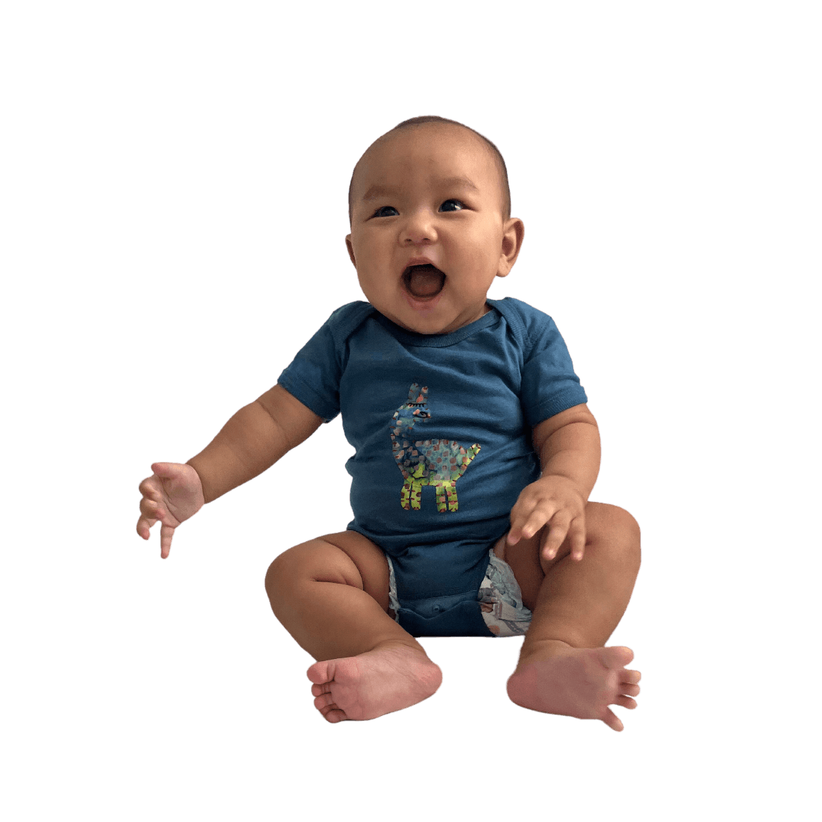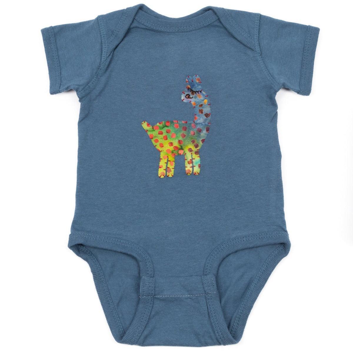 This charming Baby Onesie in blue is made of 100% cotton and showcases a delightful hand-appliquéd llama in festive fiesta batik fabric. Colors may slightly vary in each piece. The llama applique is hand sewn by refugee women artisans, making this onesie the perfect handmade and impactful baby shower present.