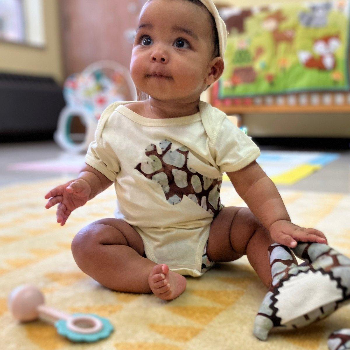 Bring the safari to your baby with this baby onesie featuring a hand-appliquéd giraffe! This adorable giraffe appliqué is hand sewn by resettled refugee artisans now living in St. Louis. Give a unique gift that not only delights, but also uplifts refugee women.