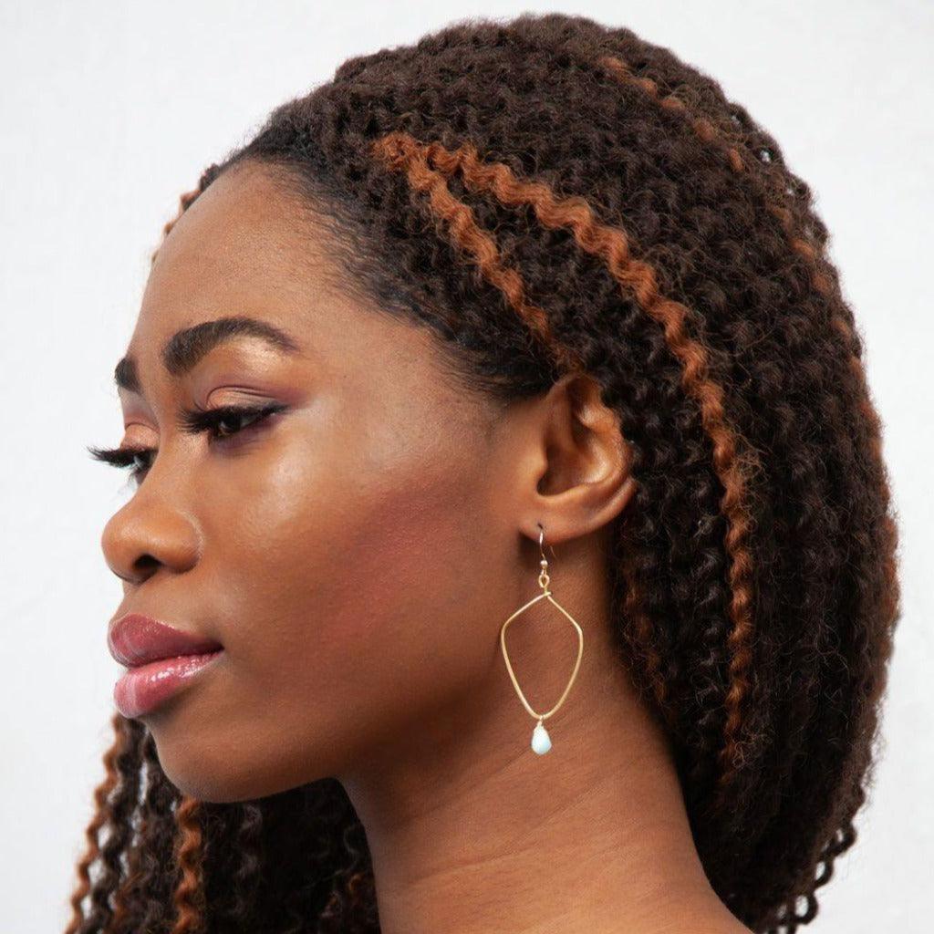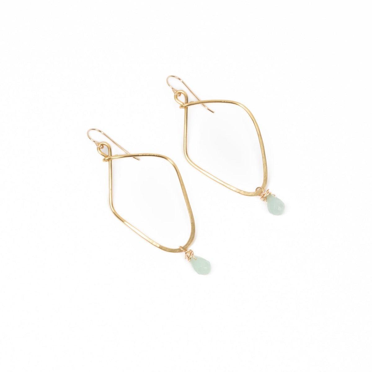 These handmade, hammered brass earrings with 14k gold filled earwires feature a modern diamond shape with a delicate polished amazonite gemstone. Known as the "calming stone," amazonite represents hope. Named for the language of the Karenni people of Myanmar.