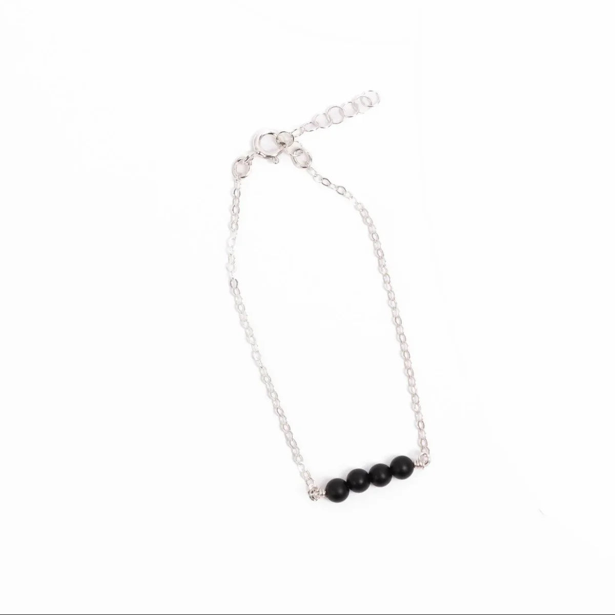 Elevate your style with the Jordan Black Onyx Bracelet, featuring four ethically-sourced black onyx beads set on a delicate sterling silver chain. This handcrafted bracelet blends minimalist elegance with timeless sophistication. A 1" sterling silver extension chain ensures a perfect fit for any wrist.