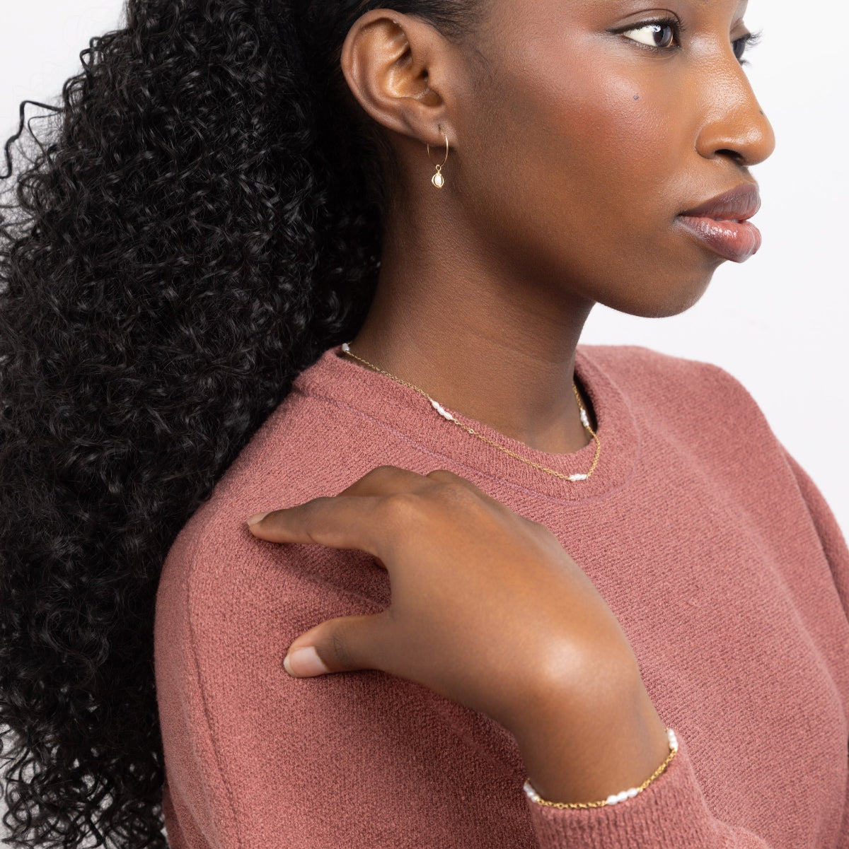 These mini-hoop earrings showcase a freshwater rice pearl charm encircled in gold. These make a stunning statement on their own or as part of your ear stack.
