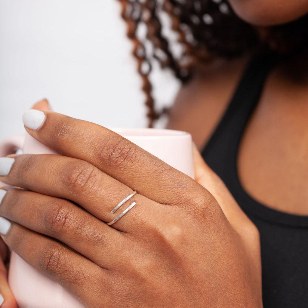 This bestselling hand-hammered sterling silver wrap ring is known for its versatility and unique design. Its adjustable feature allows for a perfect fit on any finger. Whether worn alone or stacked with other wrap rings, it adds a delicate touch to any outfit.