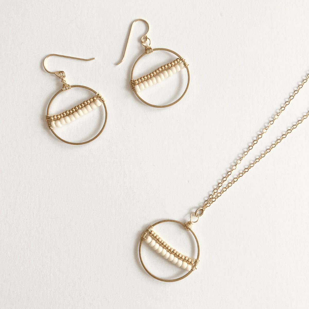 Inspired by the seeds of hope brought by our newest artisans from Afghanistan, the Samira Seeds of Hope Necklace will remind you of the hope available for all of us. Hanging from a delicate 14 karat gold filled chain, the pendant features a hoop of brass with cream and gold seeds held in perfect tension.